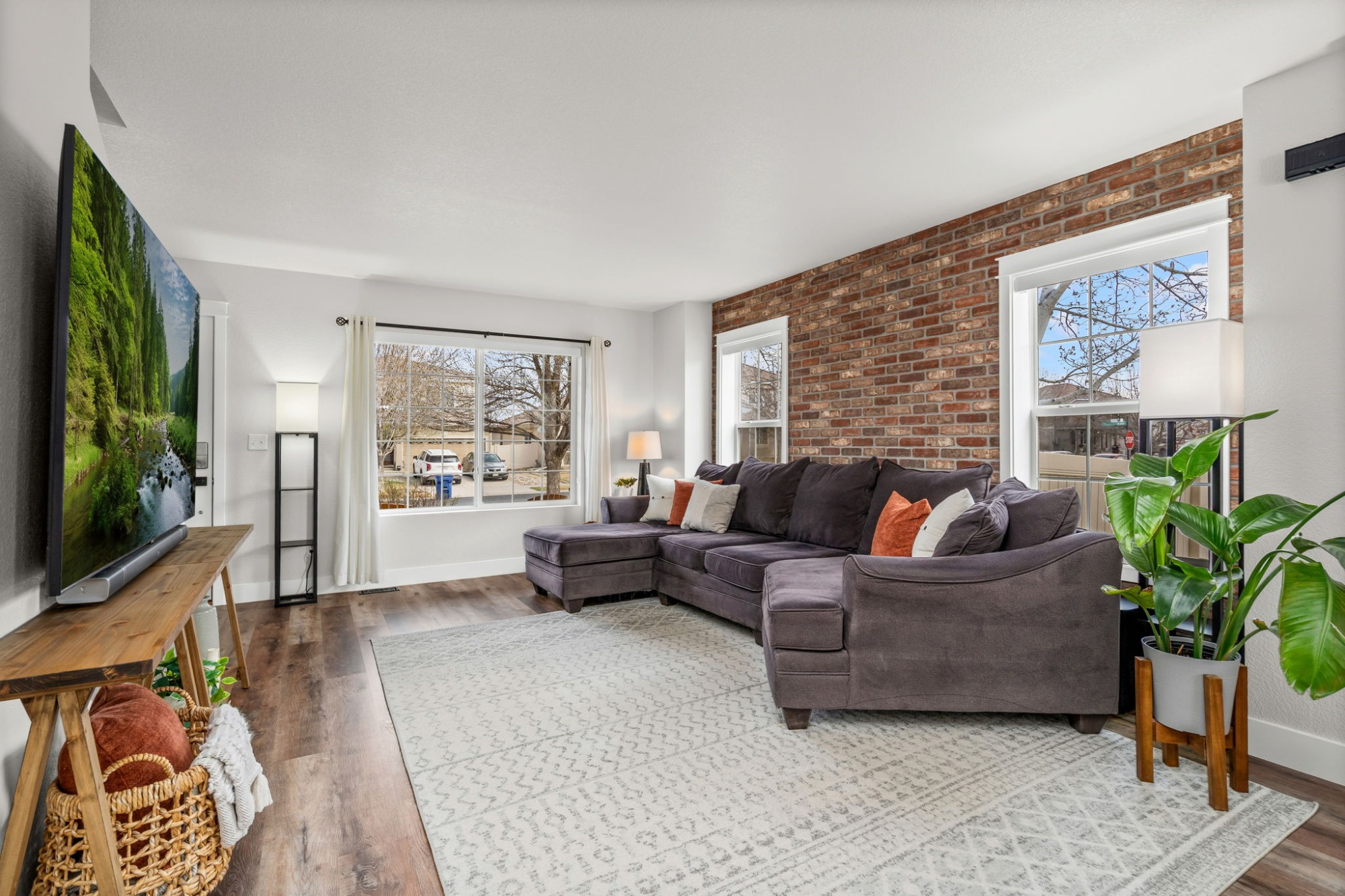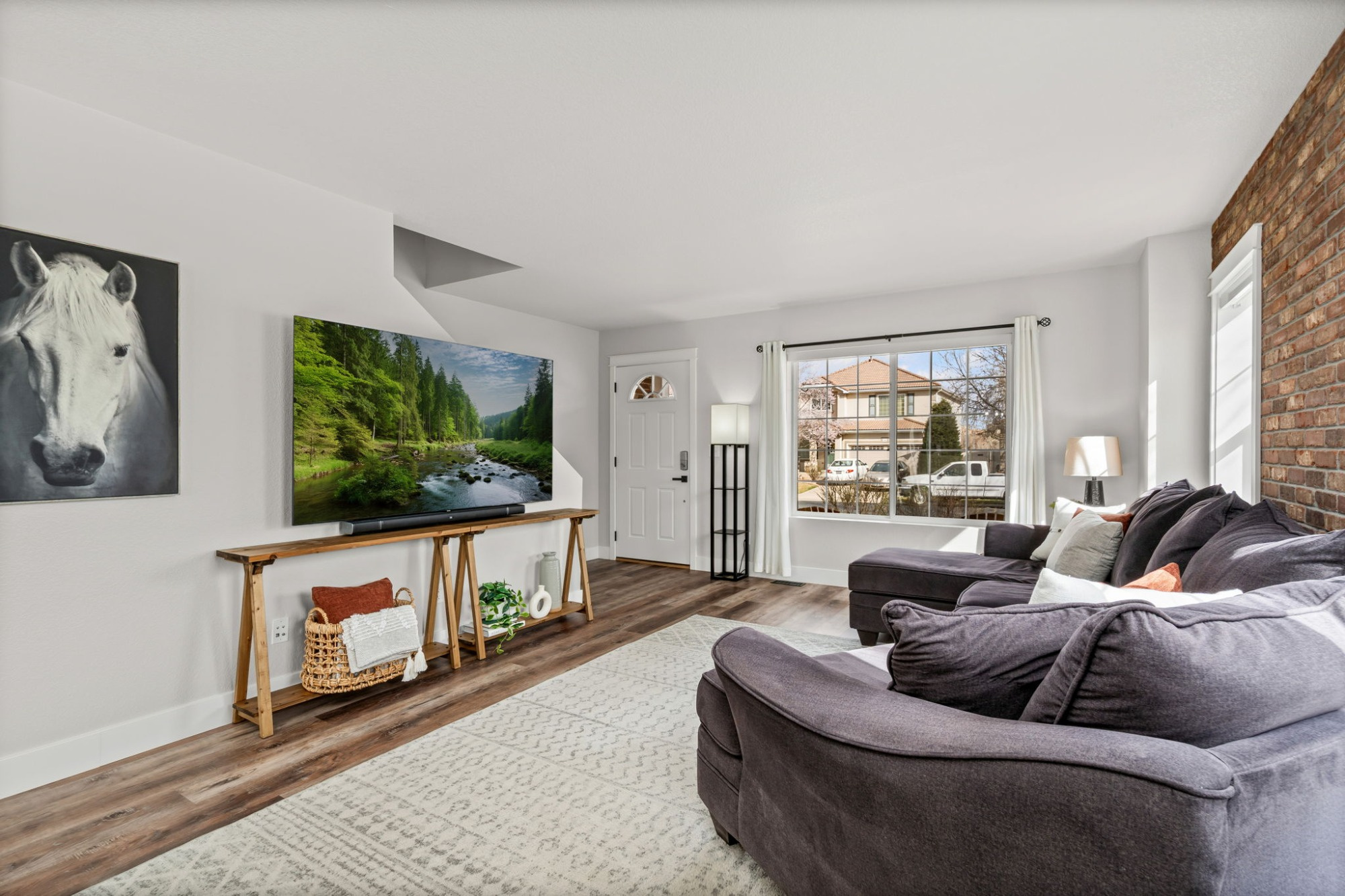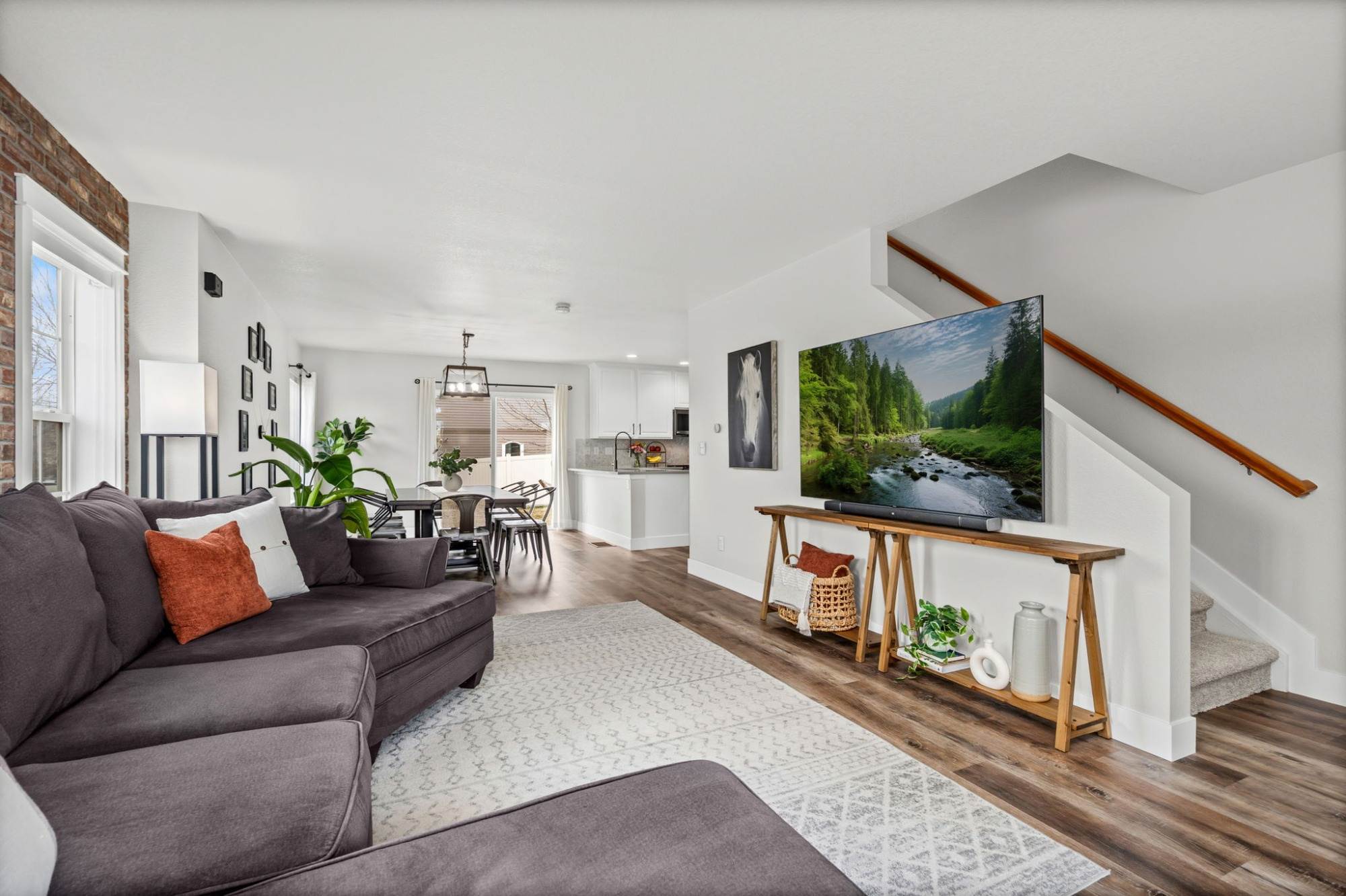 The kitchen features clean quartz counters and black stainless sink, herringbone backsplash, newer black stainless appliances, professionally refinished cabinetry, and a custom butcher-block island. The primary and full baths offer quartz counters, new flooring, and new lighting and fixtures. The spacious loft provides flexible living space for a home office, media room, or playroom. Notice the attention to detail with a classic brick accent wall, 5.25" baseboards and craftsman trim, authentic wood accent wall, matte black hardware, and updated lighting and ceiling fans. NEW LVP and carpeting throughout and water heater was replaced in 2024!
